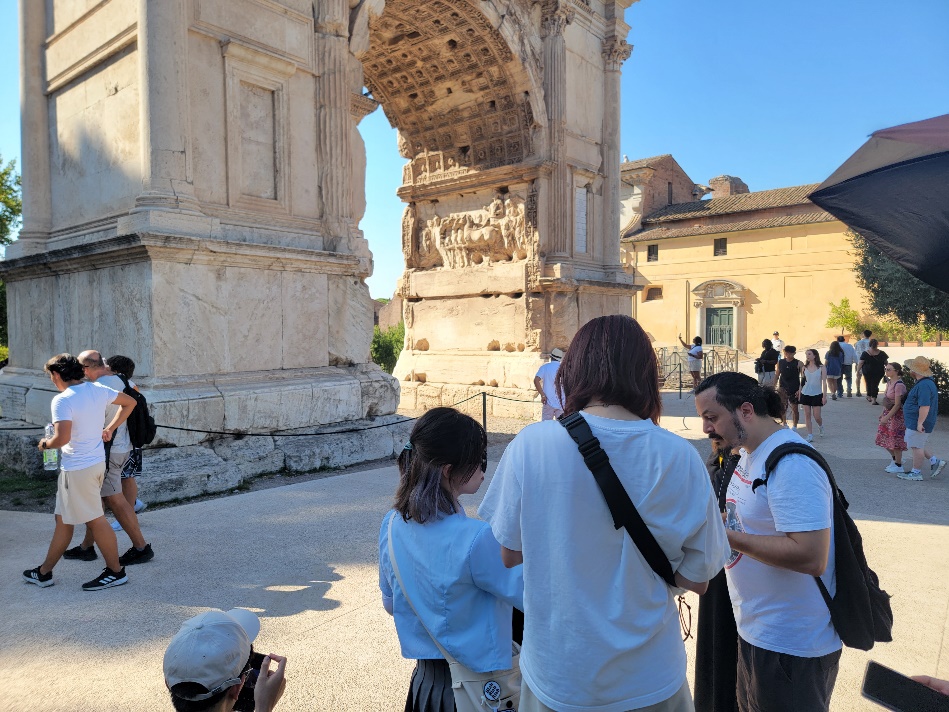 Next, the team ascended Palatine Hill, where the professor explained that it is the birthplace of ancient Rome, where, according to legend, Romulus, the founder of Rome, established the city. By visiting the palace ruins and archaeological sites on Palatine Hill, the team gained insights into the early history and culture of the Roman Empire. Under the professor's guidance, they witnessed the magnificent remnants of ancient palaces, igniting their passion for the protection and activation of architectural heritage.